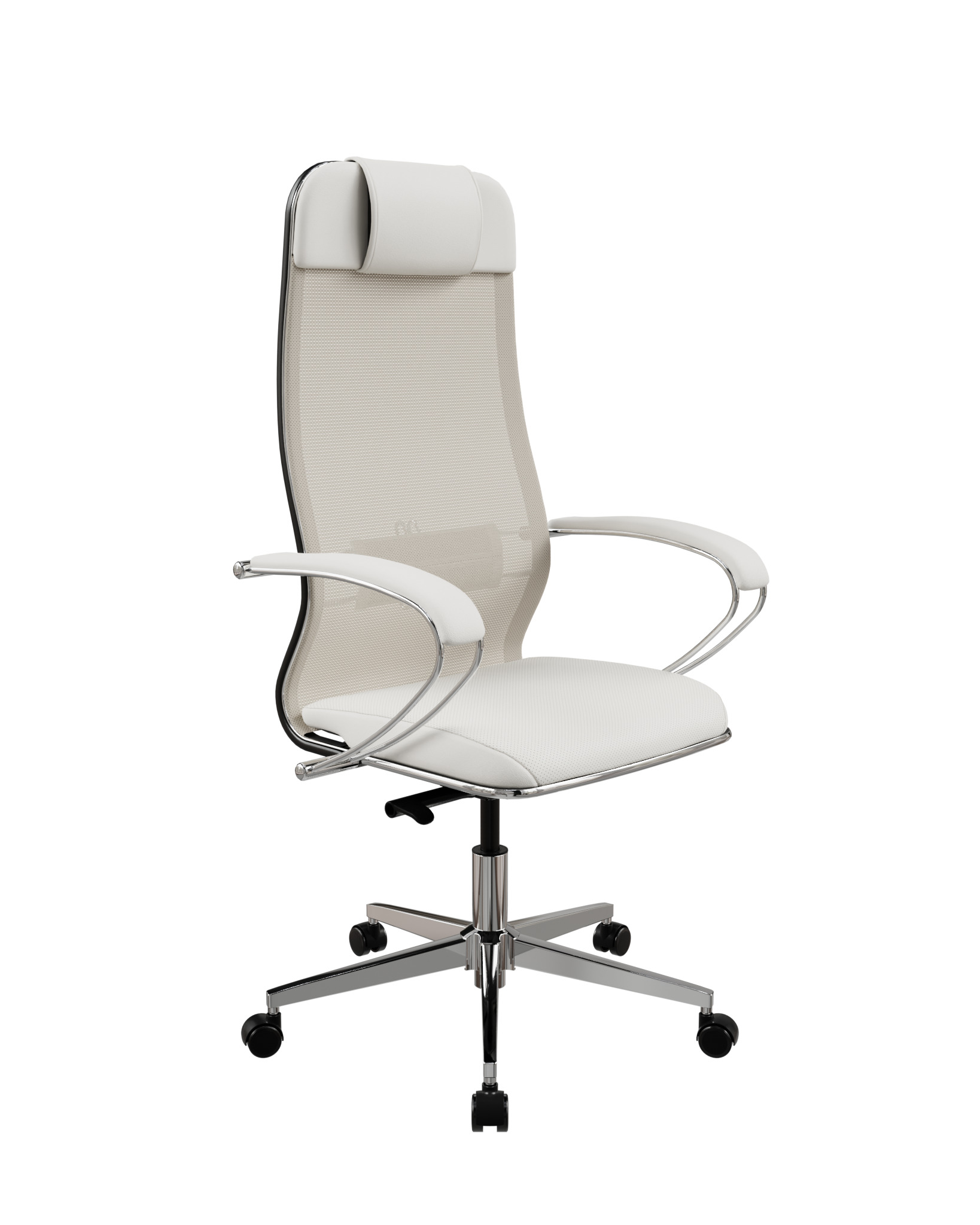 Спинка с мягким подголовником и регулируемой 2D поясничной поддержкой. Размер спинки: ширина 510 мм (L), высота 860 мм (1). Каркас спинки стальной с полимерным покрытием черного цвета, с хромированным молдингом. 2D поясничная поддержка регулируется по высоте и глубине. Подголовник комплектуется дополнительной вставкой, увеличивающей объем. Обивочный материал спинки: сетчатая ткань Х2, цвет молочный. Обивочный материал подголовника: экокожа Infinity Easy Clean, цвет молочный.