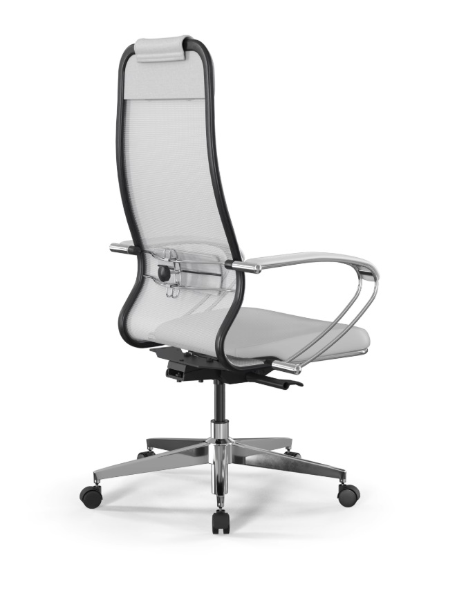 Спинка с мягким подголовником и регулируемой 2D поясничной поддержкой. Размер спинки: ширина 510 мм (L), высота 860 мм (1). Каркас спинки стальной с полимерным покрытием черного цвета, с хромированным молдингом. 2D поясничная поддержка регулируется по высоте и глубине. Подголовник комплектуется дополнительной вставкой, увеличивающей объем. Обивочный материал спинки: сетчатая ткань Х2, цвет черный. Обивочный материал подголовника: экокожа Infinity Easy Clean, цвет белый.