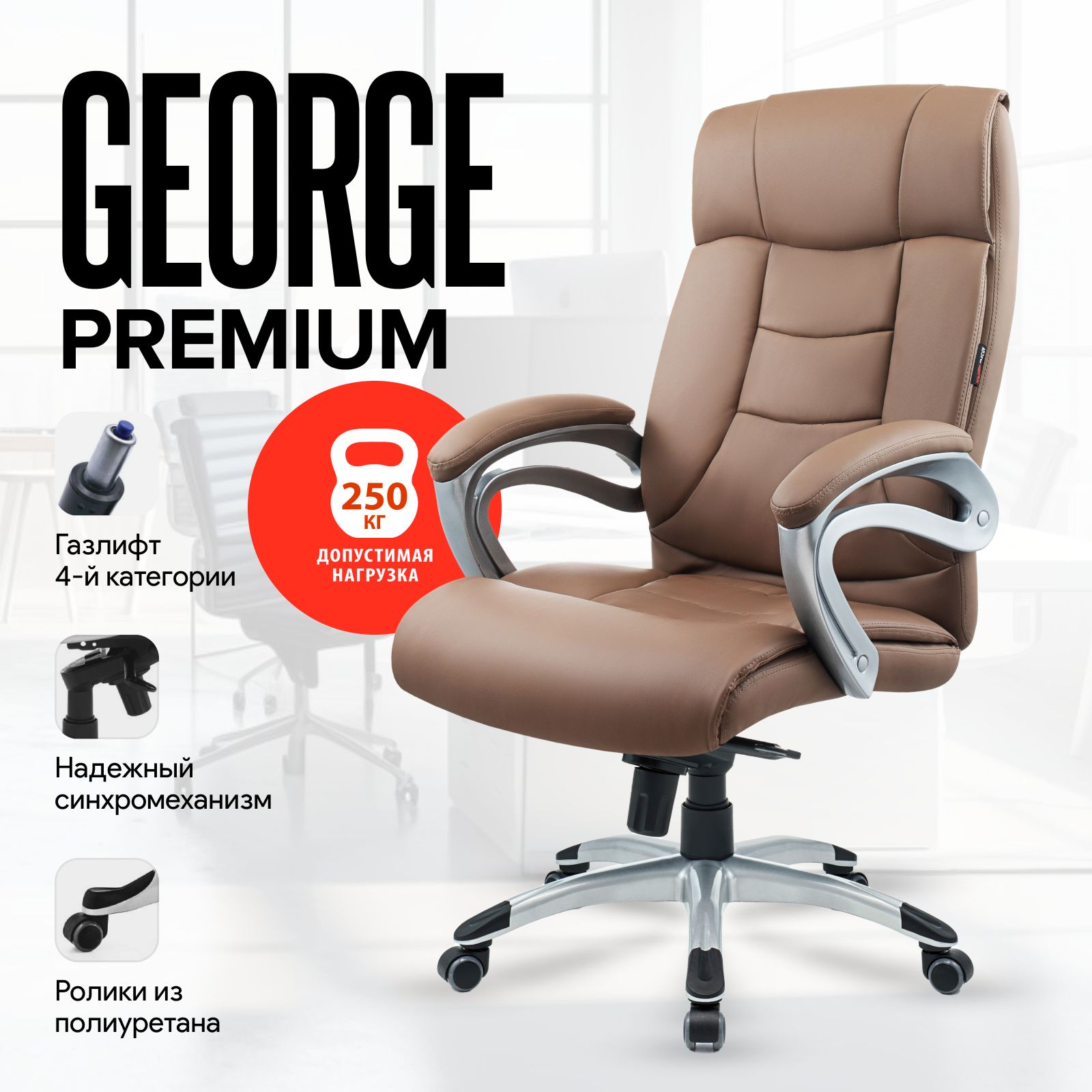 В дизайне кресла George выдержан строгий баланс между яркими запоминающимися деталями и элегантностью формы. Широкие и удобные подлокотники с мягкими накладками из экокожи обеспечивают комфортную опору для предплечий. Материал обивки сохраняет отличный внешний вид в течение многих лет. Он отводит влагу и обеспечивает хорошую вентиляцию. Синхронный пятиступенчатый механизм качания управляет наклоном кресла и позволяет зафиксировать спинку в самом удобном положении. Надежный мультиблок, который регулирует усилие качания в зависимости от веса человека. Газ-лифт обеспечивает амортизацию и плавную регулировку кресла по высоте. Прочная крестовина из углепластика снабжена пластиковыми накладками для ног, которые обеспечивают удобную посадку и защищают поверхность крестовины от царапин и загрязнения. Качественные ролики сохраняют полы из ламината и паркета, делают движение кресла легким и практически бесшумным.