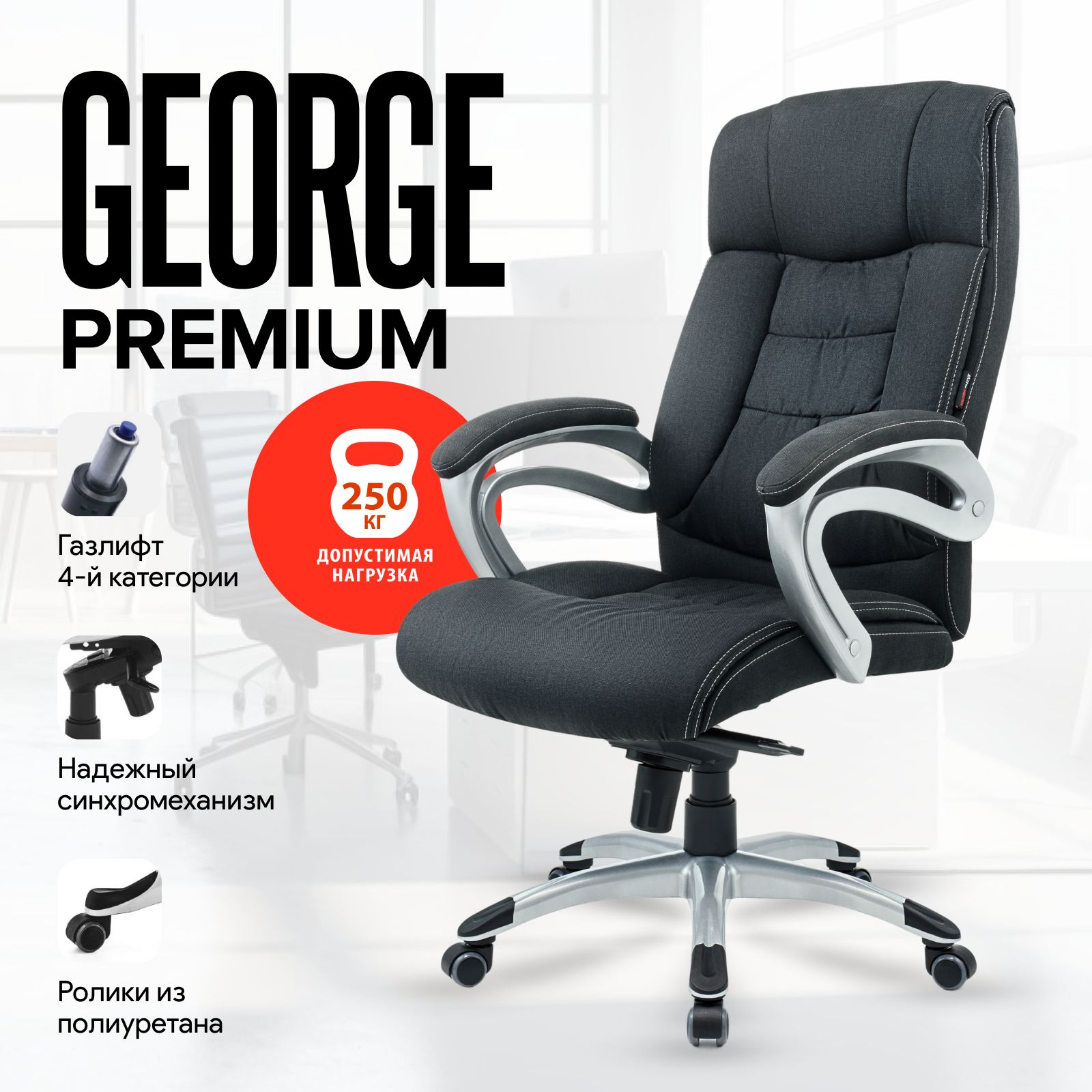 В дизайне кресла George выдержан строгий баланс между яркими запоминающимися деталями и элегантностью формы. Широкие и удобные подлокотники с мягкими накладками из экокожи обеспечивают комфортную опору для предплечий. Материал обивки сохраняет отличный внешний вид в течение многих лет. Он отводит влагу и обеспечивает хорошую вентиляцию. Синхронный пятиступенчатый механизм качания управляет наклоном кресла и позволяет зафиксировать спинку в самом удобном положении. Надежный мультиблок, который регулирует усилие качания в зависимости от веса человека. Газ-лифт обеспечивает амортизацию и плавную регулировку кресла по высоте. Прочная крестовина из углепластика снабжена пластиковыми накладками для ног, которые обеспечивают удобную посадку и защищают поверхность крестовины от царапин и загрязнения. Качественные ролики сохраняют полы из ламината и паркета, делают движение кресла легким и практически бесшумным.