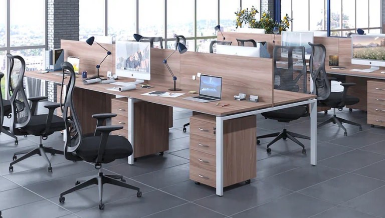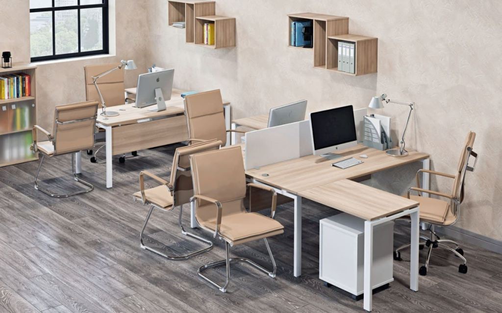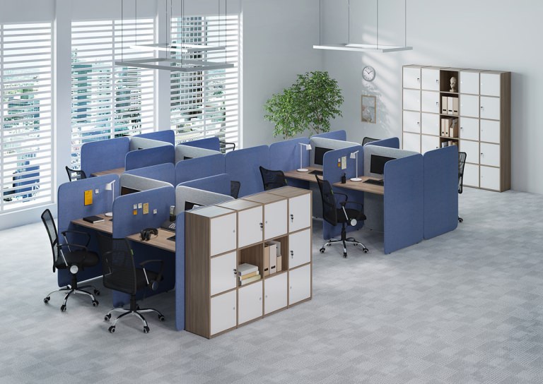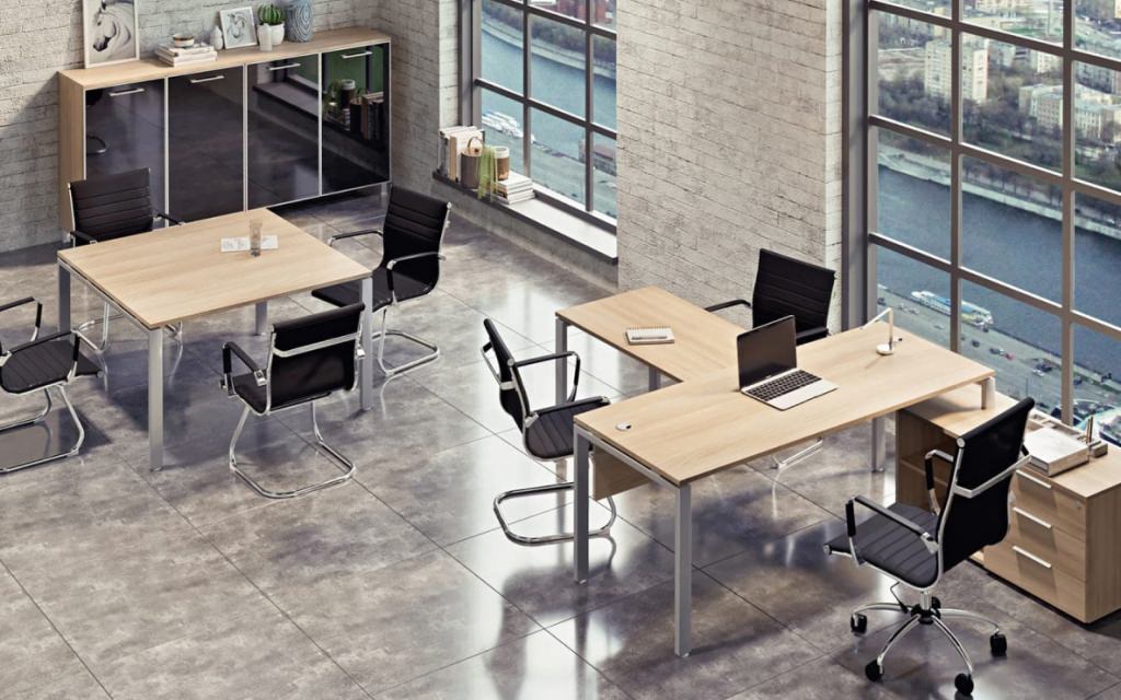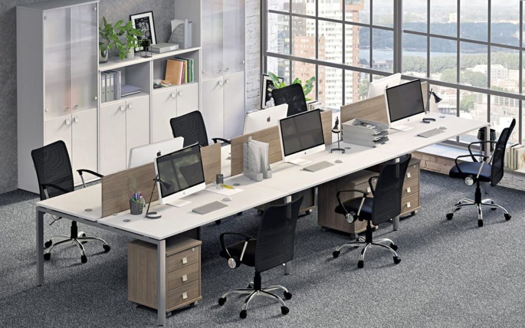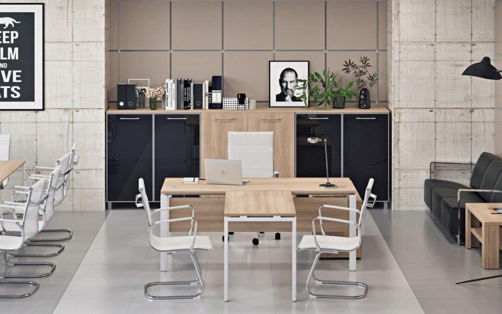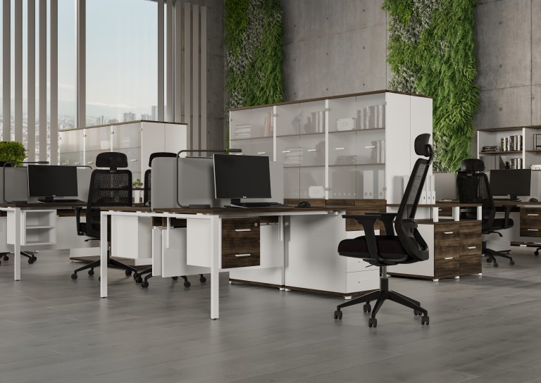Модульная архитектура раскрывает безграничные возможности организации офиса. Рабочие станции, криволинейные столы и проходные компоненты легко интегрируются в единую функциональную композицию. Устойчивый металлопрофиль в сочетании с 22-миллиметровыми столешницами из ЛДСП создает надежную платформу для продуктивной деятельности команды в атмосфере делового комфорта.