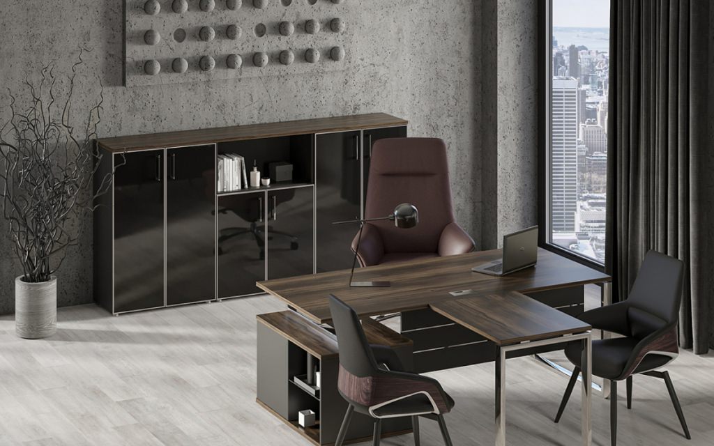 Рива Шифт – воплощение интеллектуальной эстетики хай-тек в бизнес-пространстве. Хромированный металлокаркас создает визуальную легкость и подчеркивает технологичность коллекции. Сочетание благородных древесных текстур с пыльными оттенками и блестящими элементами формирует премиальный облик кабинета, мгновенно повышающий статус владельца.