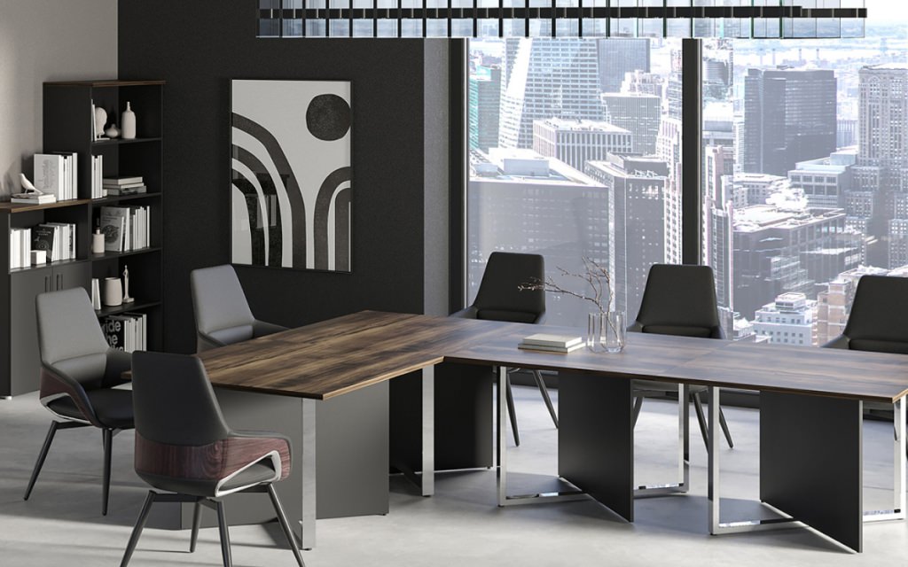 Воплощение интеллектуальной эстетики хай-тек в бизнес-пространстве. Хромированный металлокаркас создает визуальную легкость и подчеркивает т…